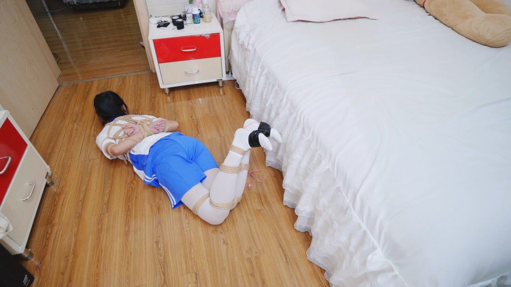 “This was a custom-made video. Xiao Leng was playing on her phone at home when she was attracted by a knock on the door. She went to open it, only to be smothered unconscious. When she woke up, she was bound and gagged with tape. Xiao Leng struggled to slide off the bed to the floor, but her kidnappers discovered her when they returned. They stuffed a bouncing bullet into her leg and, to prevent escape, bound her feet with two bouncing sheets. After playing with her for a while, they decided to sell her. They untied the ropes around her legs, took photos of her from the front, back, and sides, and then forced her to leave the house.”