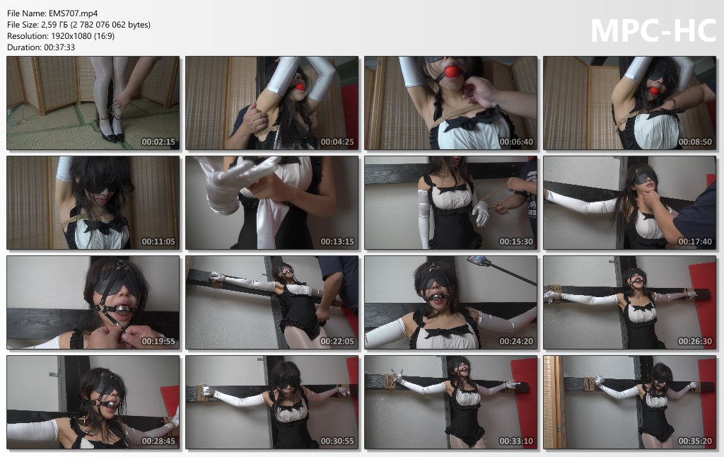 “1. The 0 in high-heeled white silk stockings is tied to a pillar, receiving punishment from her master, including a lot of groping and mild masturbation. 2. The maid is asked to change her gloves (to a longer pair). The ultimate weapon, vibrating nipple clamps, is used; the maid’s trembling uncontrollably the moment they are opened…”