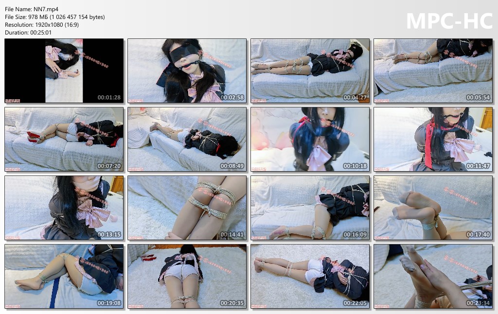 “The outfit is a dress, thin stockings, and high heels. The main style is Japanese-style bondage with legs together. The video begins with the user being suffocated at home. Upon waking, he is bound and gagged, struggling on the sofa. He tries to jump away but is caught. The gag is replaced with stockings and duct tape. Then his high heels are removed, and his feet are touched. Finally, he is tied to the floor in a four-legged bondage position and tickled.”