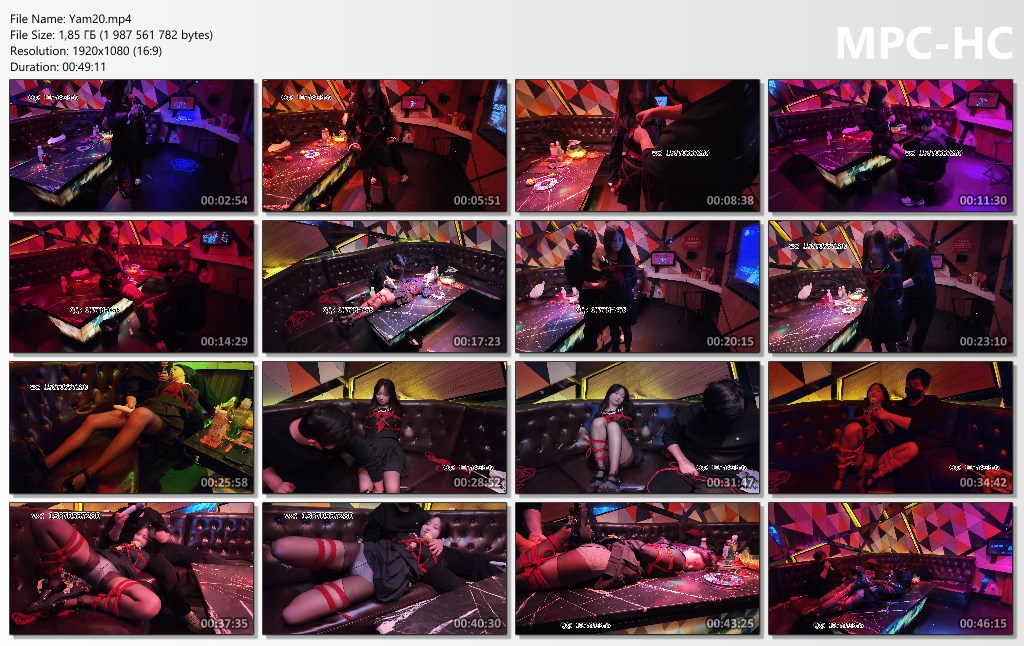 “Dongdong is tied up while singing in a karaoke bar, tied to a table, and played with with a vibrator. Not satisfied, she’s then subjected to M-leg manipulation, trying to escape but unable to. The way she sticks out her tongue is incredibly beautiful. Finally, she’s forced to lie face down on the table by four horses.”