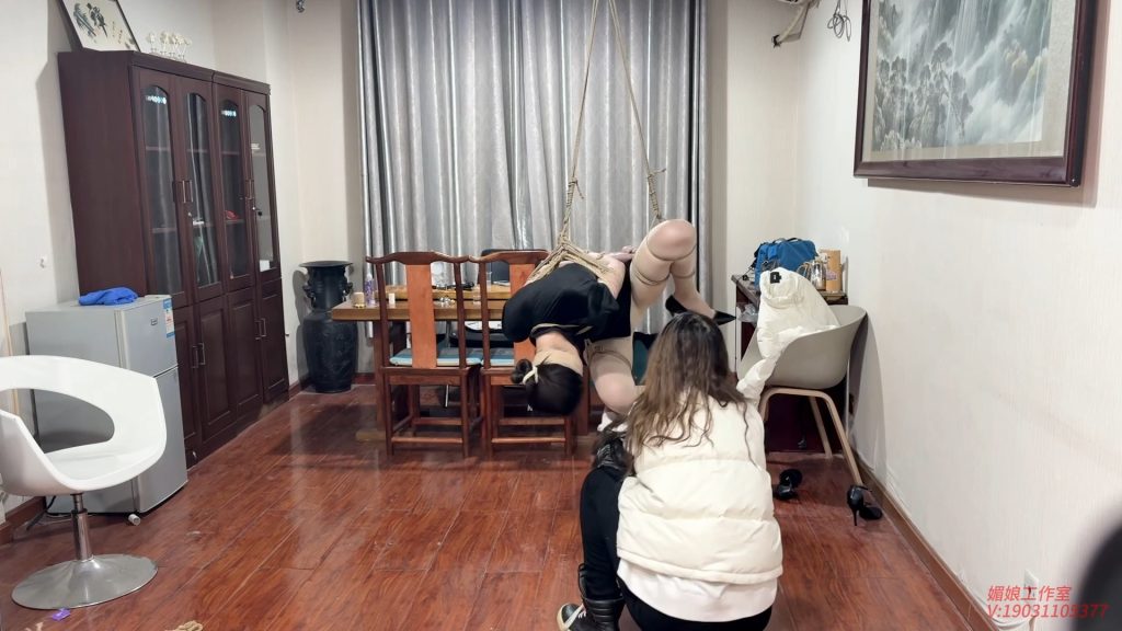 “Side-lying, legs spread, suspended bondage, a fake gag in her mouth, a gag inserted into her anus. With struggle, her body slowly rotates, the bells on the gag jingling, tormenting Jin Chu into painful whimpers. Her arms have begun to turn purple, her hands completely white and bloodless. It’s unknown how long she can endure this…”