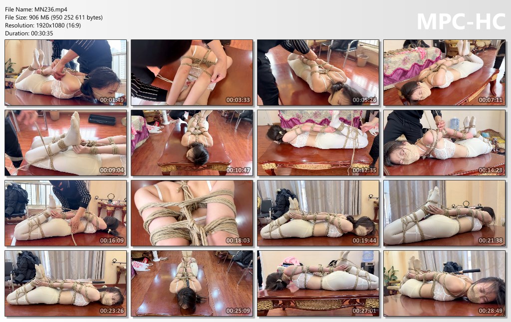 “Jin Chu, in white lace lingerie, her breasts barely concealed, is bound wrist and ankle, lying face down on the coffee table, at her mercy. The pain isn’t from the tightness of the ropes, but from the despair of each rope being tied to her body. She can clearly feel the ropes increasing in number and tighter on her upper arms, elbows, calves, and thighs, tightly constricting and squeezing her body, making it hard for her to breathe. A high-powered dildo is forced into the tightly pressed thighs, and a continuously discharging stun gun is pressed against her back with ropes. The heat and electric shocks in her private parts cause Jin Chu to finally break down, writhing and crying. The lights go out, leaving her alone to enjoy this exquisite pain…”
