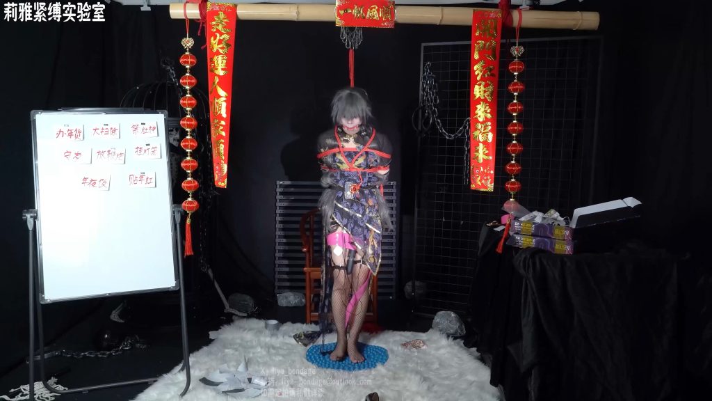 “Plot Description: Busy preparing for the New Year: 1. Preparing New Year’s goods (self-bondage and packing New Year’s goods) 2. Spring cleaning (removing personal items) 3. Offering sacrifices to the Kitchen God (candles) 4. Staying up late on New Year’s Eve (pressure plate and electric shock device) 5. Setting off firecrackers (stomping balloons) 6. Hanging lanterns (single-leg suspension) 7. New Year’s Eve dinner (sticky rice) 8. Pasting New Year’s Red (Pasting Spring Festival Couplets on the Body)”
