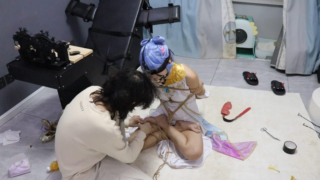 “Dong’er barely got any rest before facing the next punishment: Ebi-binding and forced high placement. The assigned position is a cross-legged position with the soles of both feet facing upwards, each foot resting on the other leg, with the soles of both feet completely facing upwards. (Interested friends can try it; it’s much, much more uncomfortable than a regular cross-legged position.) Then, ropes are wrapped around the soles of the feet and secured to the thighs, with additional fixation to the toes. Blindfolded with duct tape, gag with a metal harness, and nose hook are all applied. Then, an electric shock ecstasy stick is placed in its designated spot. Vibration is set to high, and shock to low (after all, it’s going to be placed there for a long time). This shoot took place immediately after the “Extreme Four Horses” episode (1006), without any breaks, so the model’s stamina was truly pushed to the limit. The cross-legged position with both feet on the lap and soles facing upwards was incredibly demanding. With blindfolds, nose hooks, metal harnesses, a gag, and the strict ebi pose, she looked quite disheveled (especially considering she was drooling and sniffling just 5 minutes earlier in the previous episode). Under such intense pressure, she screamed like a pig being slaughtered, eventually losing feeling in her feet and crying in terror. Actually, it was just her being helpless and scared; the temperature and color of her toes were within the normal range. After 4 minutes and 30 seconds, she cried and begged for mercy to no avail, then exclaimed “Damn it!” But I insisted she continue until the allotted time, then she started crying and howling like a pig being slaughtered… The switch from anger to pleading was particularly interesting. Around the 30-minute mark, the model kept crying out in pain, with a gag in her mouth and a nose hook on, incoherently saying her “foot is broken.” Her breakdown and crying were particularly pathetic. The Ebinatorial pose combined with the impact of the vibrator caused the cosplayer to fall backward to the ground multiple times, pitifully begging me to help her up. (Please rest assured, I supervised her throughout and checked the temperature of her extremities; there was no risk of nerve damage.) High-intensity, continuous, and long shoots! Gradually developing works that push the limits and challenge high pressure—the key is “continuous shooting.” Several works combined have exceeded 5 hours of shooting time. Being continuously subjected to medium-to-high intensity torture, her repeated breakdowns and pathetic appearance actually have a kind of pathetic aesthetic. The only drawback is that the wig’s head circumference is too large; whether wearing an eye mask or tape, it ruins the hairstyle and affects her appearance. The large wig also made the nose hook and gag gag particularly tight”