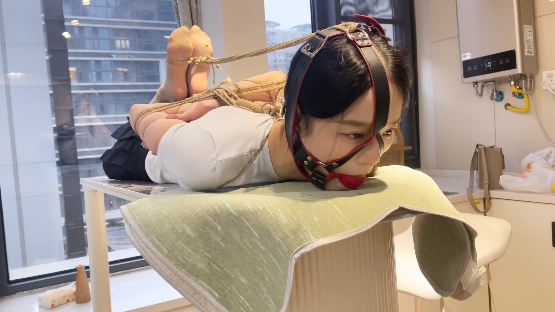 “YOYO has a very sweet appearance, a slender yet shapely figure, very thin but well-endowed, making her one of the best models we’ve recently photographed. This time, she’s been tied up in super tight Chinese five-flower rigging, the rope digging into her arm muscles, tied up like a four-horse and placed on a table, then gagged, leaving her to quietly drool.”