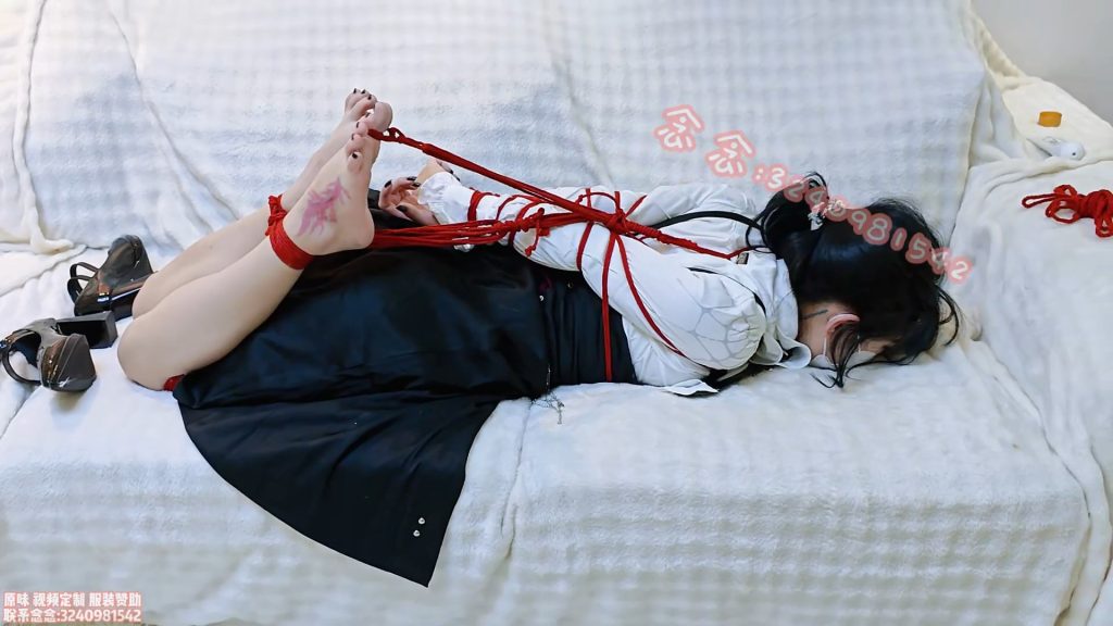 “Kafka cosplay: Straight-armed Four-horse Ribbon with Toes Bound. This is an old cosplay, and I’m not really satisfied with it. My wig was already messed up when we got to this part, so I didn’t wear it, which might look a bit out of place. The content involves straight arms bound to four horses, placed on a sofa. First, I wear shoes, then after a while, I take them off and connect my toes to the horses as well. //The tightness of the toes being bound to the horses is really strong; I have to force my whole leg straight, but it really hurts..”