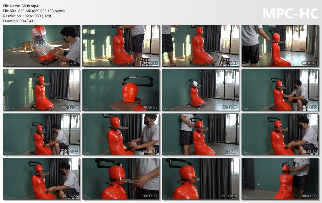 “I have always planned to make a furniture series, but my ability to make it myself is limited, so I can only buy ready-made materials and piece them together. The plan is to make a small trailer that can be kneeled and used at home, and the wooden tray can be used to place things. While the car was being made, Shiyu was asked to practice the Vajra sitting. After all, she had to kneel on the cart for more than an hour. For the integrity of the furniture, I decided to use the tape mummy method for the first attempt, which would give me a sense of restraint and inhuman materialization. The process of wrapping the mummy took longer than expected. The whole shooting process took two and a half hours. When it was finally unwrapped, Shiyu could no longer stand. It has been hot recently. The sun has tanned the whole house red, the walls are hot, and the tap water is also boiling. In this weather, turning on the air conditioner to the highest level has little effect. I sweated when wrapping, and Shiyu in the plastic wrap and insulating tape felt even worse. In this state, she still had to accept the control and wall placement, and finally wore an open mouth and was fed sheep’s food. When she said she couldn’t stand it anymore, she was still left there for a while. When the mummy was unpacked, hot and humid air gushed out with every scissor cut. Shi Yu was covered with sweat and crawled down to the ground with difficulty, lying there unable to move.”