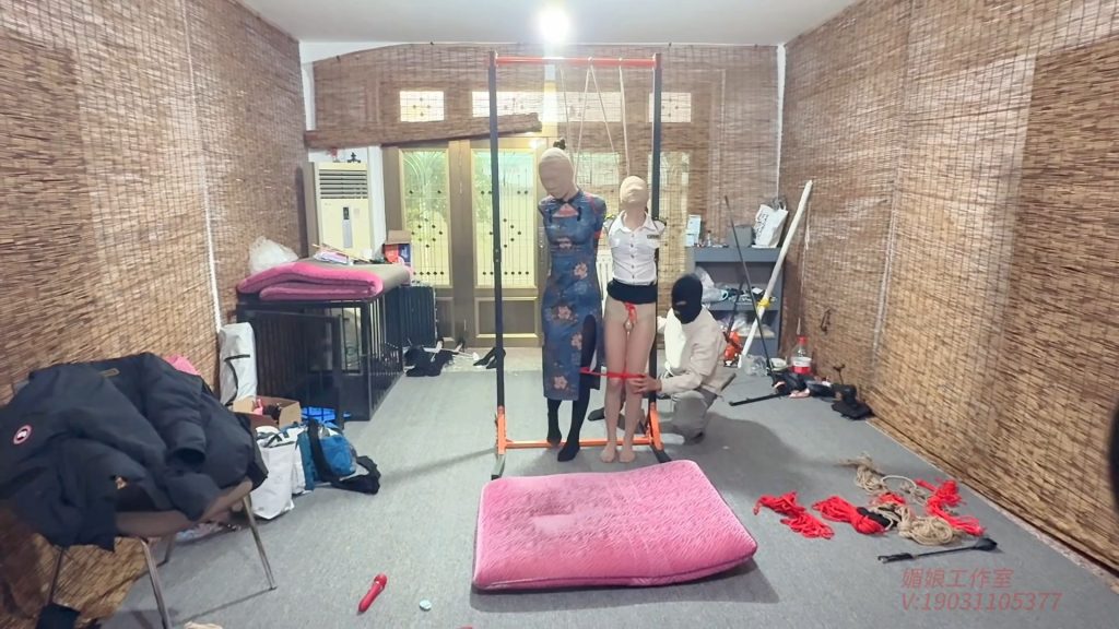 “Initially, the models are suspended by straight arms, fixed to a support frame. Their calves and ankles are fixed together, and the right model’s thigh is fixed. T-balls are placed inside the stockings to stimulate the models’ private parts. The models’ buttocks are whipped, and the player appreciates their struggle. Then, the models are put down and kneel on a mat, their buttocks fully exposed… Finally, the models are bound tightly, and the player competes to see who can untie themselves first, with the player constantly interfering during the game.”