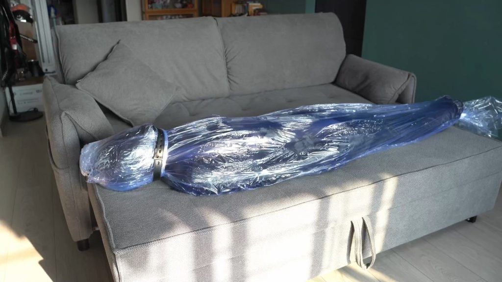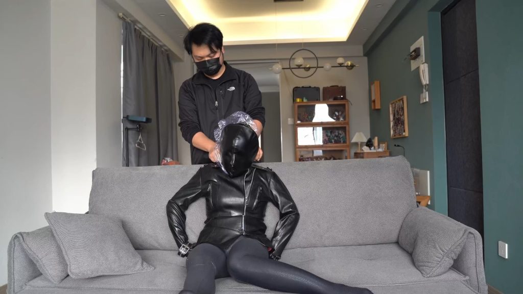 “After I pulled out a huge pile of stuff, Shiyu asked what I was going to do. I said, “Put it on!” Shiyu still looked at me with confusion because I was carrying three Zentai suits, a full-body sleeping bag, several masks and hoods, and the heat-shrink wrap she dreaded. It took a long time to get everything on, and I filmed her struggling to put it on. Shiyu found it difficult just to move her body, and her breathing was unusually heavy. Putting on the leather hood was the most painful moment for her; all the wraps were compressed again, giving her a feeling of falling into an abyss. Then, the heat-shrink wrap was used, making the abyss feel like hell. After putting on the leather sleeping bag and the one-piece heat-shrink wrap, the stuffiness reached its peak, and moisture condensed inside the wrap. At this point, Shiyu’s internal control was activated, and she actually managed to orgasm several times under the tight, stuffy insulation. Finally, I told Shiyu to serve me well, and if I satisfied her service, I would remove one layer of shackles, until finally, she would be used as a Fiji monument”