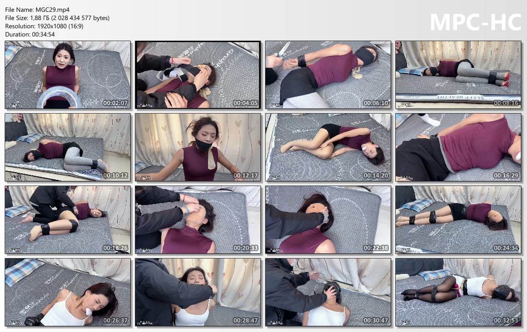 “Story Background: Ling’er wins the crown in the city’s model talent competition, winning the favor of Mr. Wang, one of the judges. After the competition, Mr. Wang, who is already married, invites Ling’er to dinner, and the two begin an improper relationship. However, in another corner of their passionate world, a pair of eyes are already watching them. Mr. Wang’s wife hired a detective to follow the two and uncovered evidence of their long-term infidelity and chaotic relationship. When the detective suggested she report it to the police, she harbored another wicked idea. So, after following her, Mr. Wang’s wife lured her to a secluded place, then smothered her from behind until she was unconscious. She took her to a room, interrogated her, and bound her. To prevent her escape, she was bound with duct tape and gagged, leaving her alone in the room to struggle. After a period of struggle, Ling’er managed to break free of her wrists, but was caught by Mr. Wang’s wife just as she was leaving. Mr. Wang then subjected Ling’er to even more severe rope bindings, stripped her of her grey stockings, revealing her sexy flesh, and then began to wrap her entire face, nose, and eyes with duct tape. Finally, he inserted a vibrator and began to torture her…”