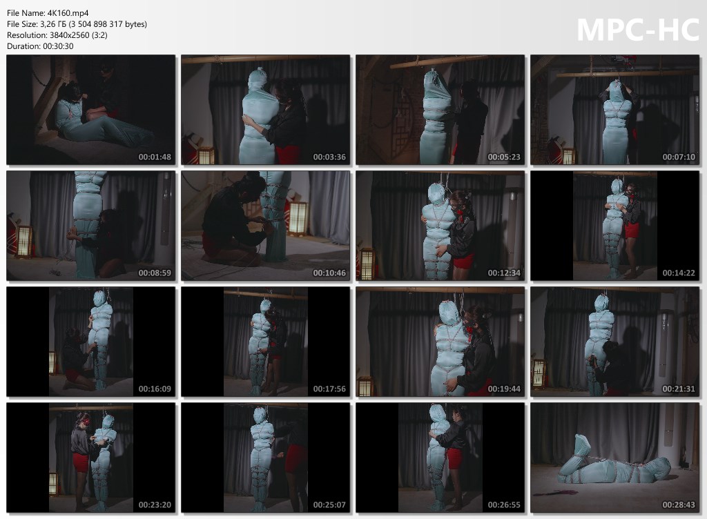 “Part 1 imitates a very, very old film. The models are completely naked. The runtime is 30 minutes. Synopsis: A tenant is caught skipping rent, stripped naked, stuffed into a silk bag, and then tortured by the landlord with ropes and a stick.”