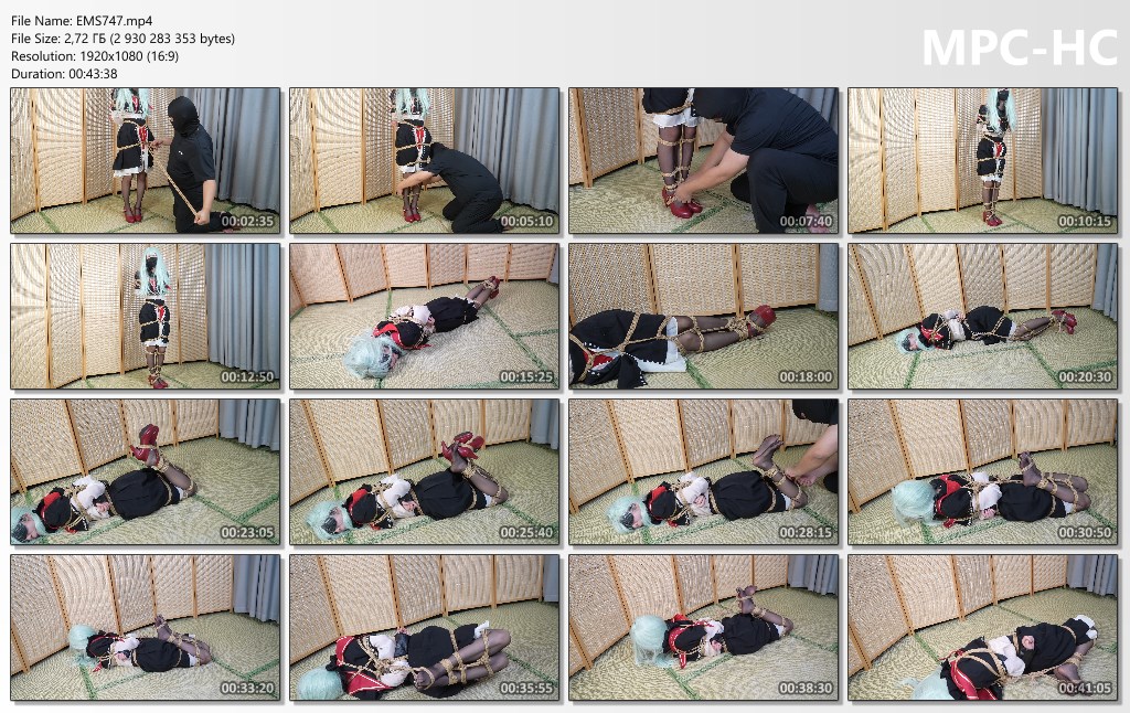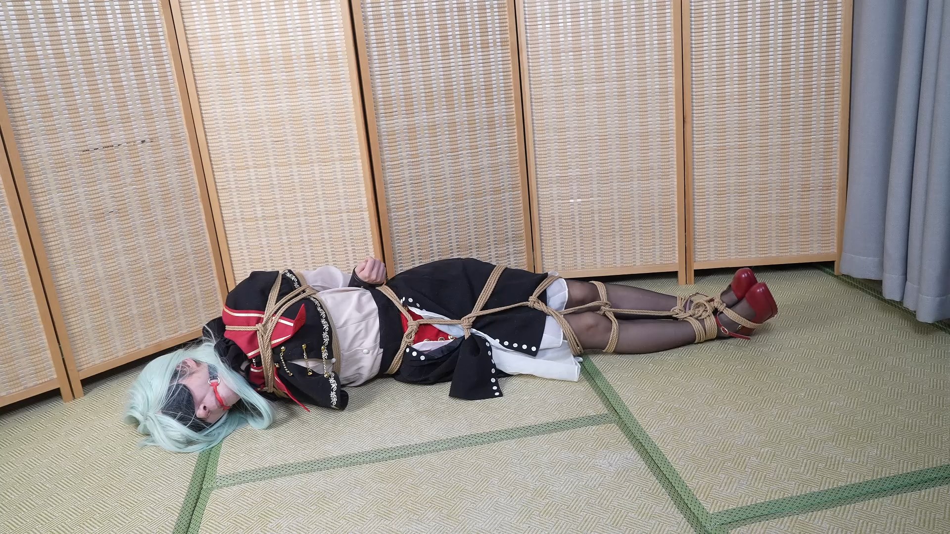 “Aww, the beautiful cosplayer, is back with another look! This time it’s Wakaba Mutsu, suspended and fully bound, tortured throughout! She’s rolling on the ground moaning and groaning, revealing her beautiful black-stockinged feet—truly tempting!”