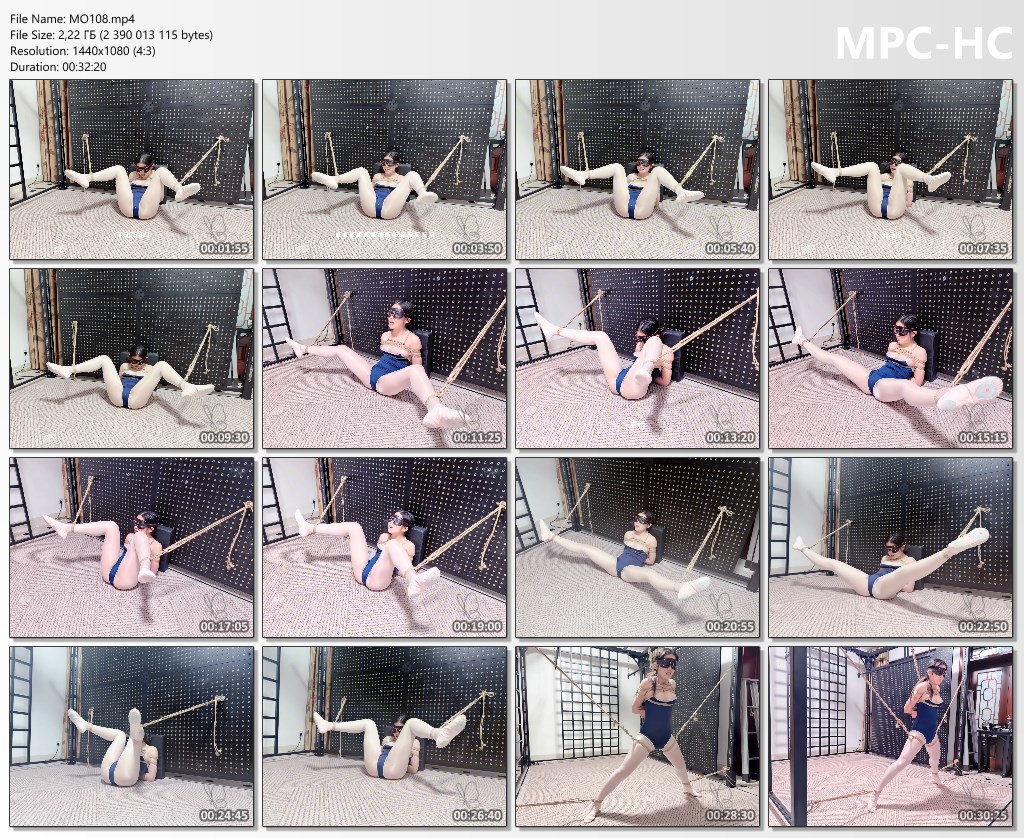 “A cute female student in white stockings and a school swimsuit undergoes a flexibility challenge, performing a split with her legs bound. Her beautiful legs struggle helplessly under the stimulation of bouncing penis, unable to escape.”