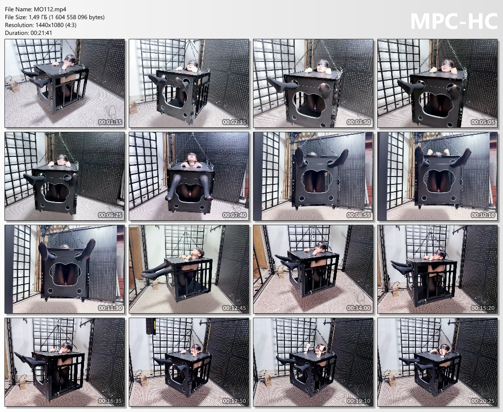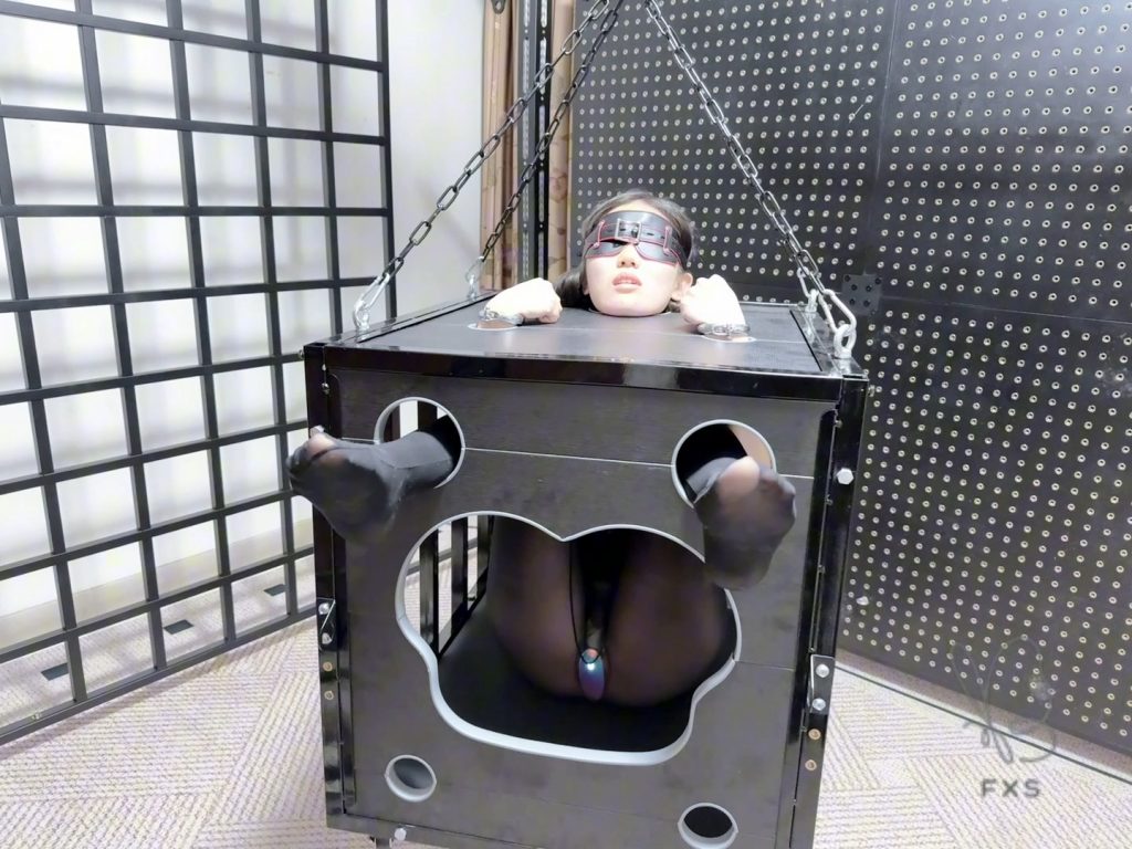 “An 80+ pound female student in a black silk bodysuit challenges herself with cage bondage. Her breasts go out of control, completely helpless, only able to tremble and climax repeatedly in the air.”