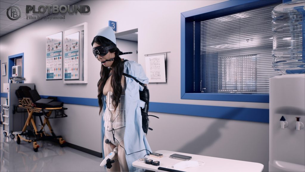 “Because Xiaoyou’s work performance has been consistently excellent, she has been transferred from the hospital reception area to the ward area. Xiaoyou also needs a new uniform, new equipment, and new work tasks. This video is still Xiaoyou narrating while working; excerpts of her narration are below. “Because my work performance has always been quite good, I was transferred to a new position as a ward nurse. I also got a new uniform. Underneath the uniform, I need to wear a matching corset to give patients a better impression. After that, I have to take off my bra, leaving only the electric shock nipple cover-up, and then put on the electric shock plug, which is also useful, of course.” “My new position is on a shelf at the entrance of the ward area. I need to open my nurse’s uniform, stand on the shelf, and a lever on the shelf can be extended until it deeply enters my body, then I am completely supported and secured on the shelf. Then, the doctor will put on a single glove to bind my arms behind my back, so that I always maintain an upright posture. Finally, the wire of the electric shock plug that has been placed in my body needs to be inserted into the electric shock device on the table next to me. After that, I need to stay here without moving and maintain the best posture.” Just like before, patients can use my body and my groans to help patients in physical pain relieve their emotions and bring them emotional comfort. And different electric shock buttons will also produce different sounds, giving patients different kinds of comfort. This work continues until 10 PM. At 10:30 PM, it’s the inpatients’ rest time, and I no longer need to provide comfort services. However, of course, it doesn’t mean I can leave work; I still have other things to do. At this time, the doctor will come and put a blindfold, gag, and earplugs on me, completely shutting down my five senses. Finally, the doctor will adjust the electric shock device to a continuous, randomly changing mode. After that, I will fall into a state of complete darkness and silence, a state that amplifies my perception of the metal rod inside my body, and makes me more sensitive to the electric shocks coming from my chest and back.”